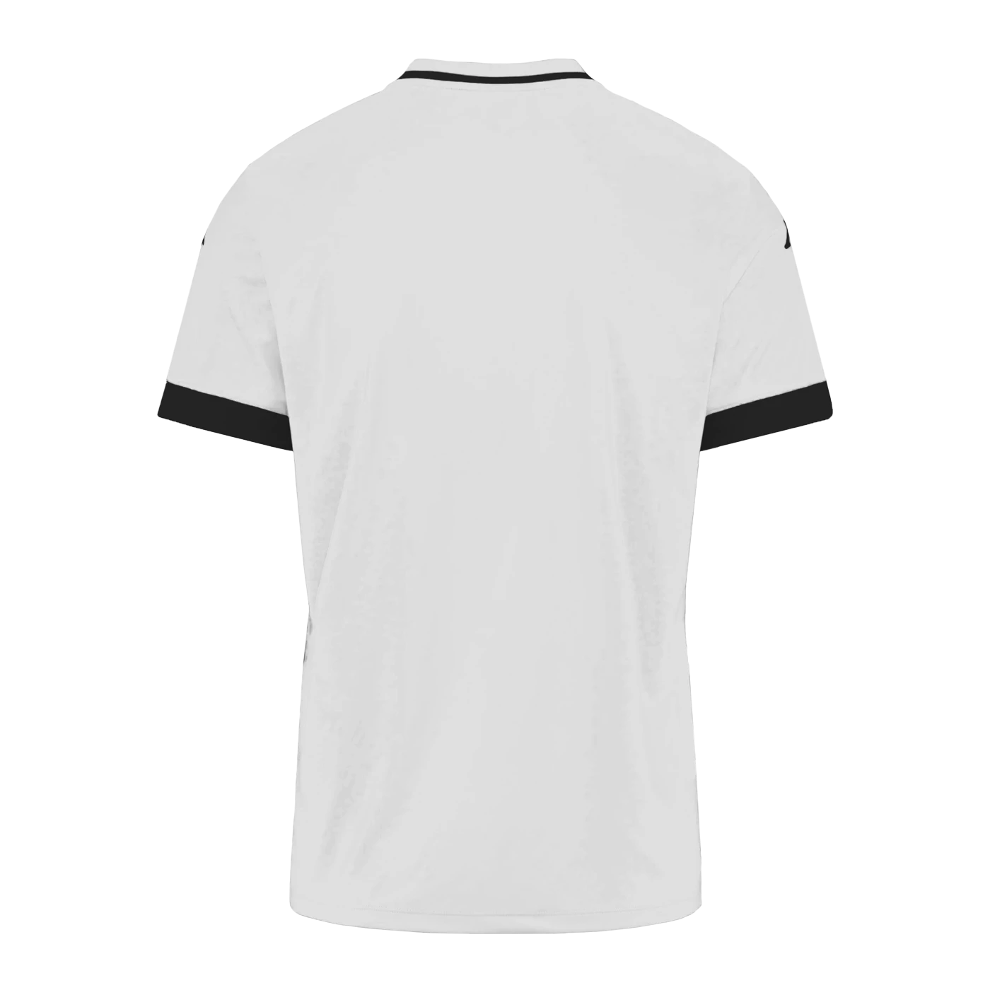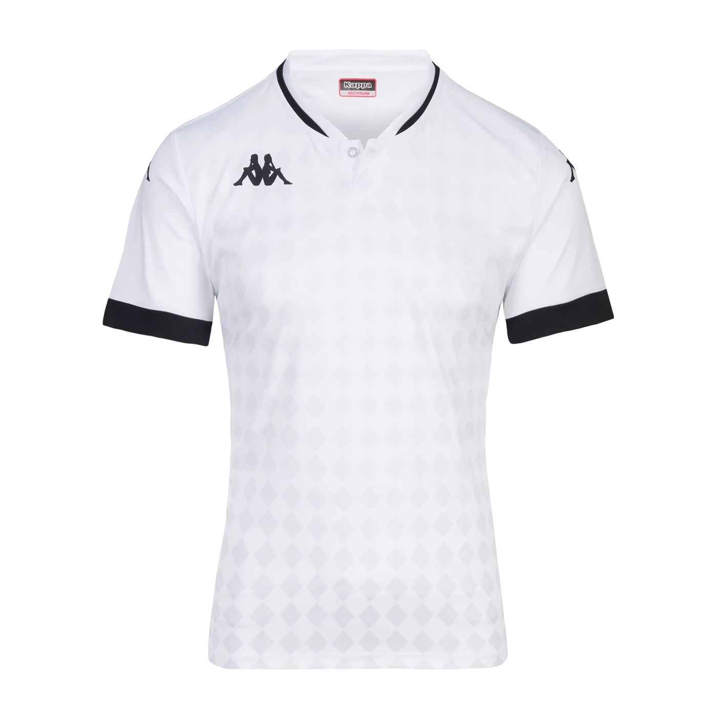 KAPPA4TEAM. Game shirt for men in interlock fabric. SLIM FIT. Short sleeve, round neck with button closure, insert on the bottom of the sleeve and sublimation printed graphics on the front panel. Omini logo printed on front and sleeves.