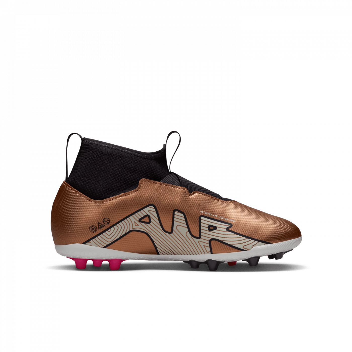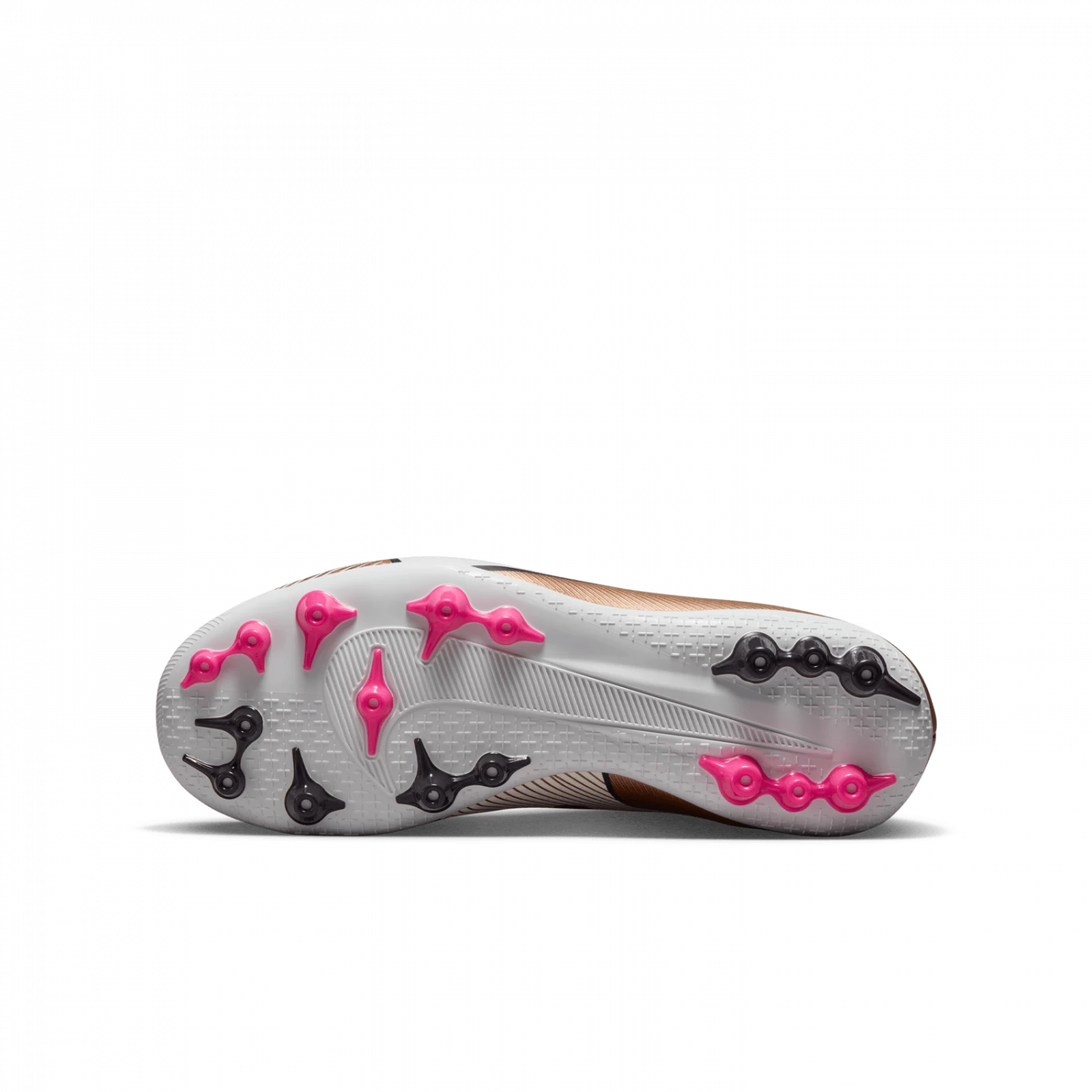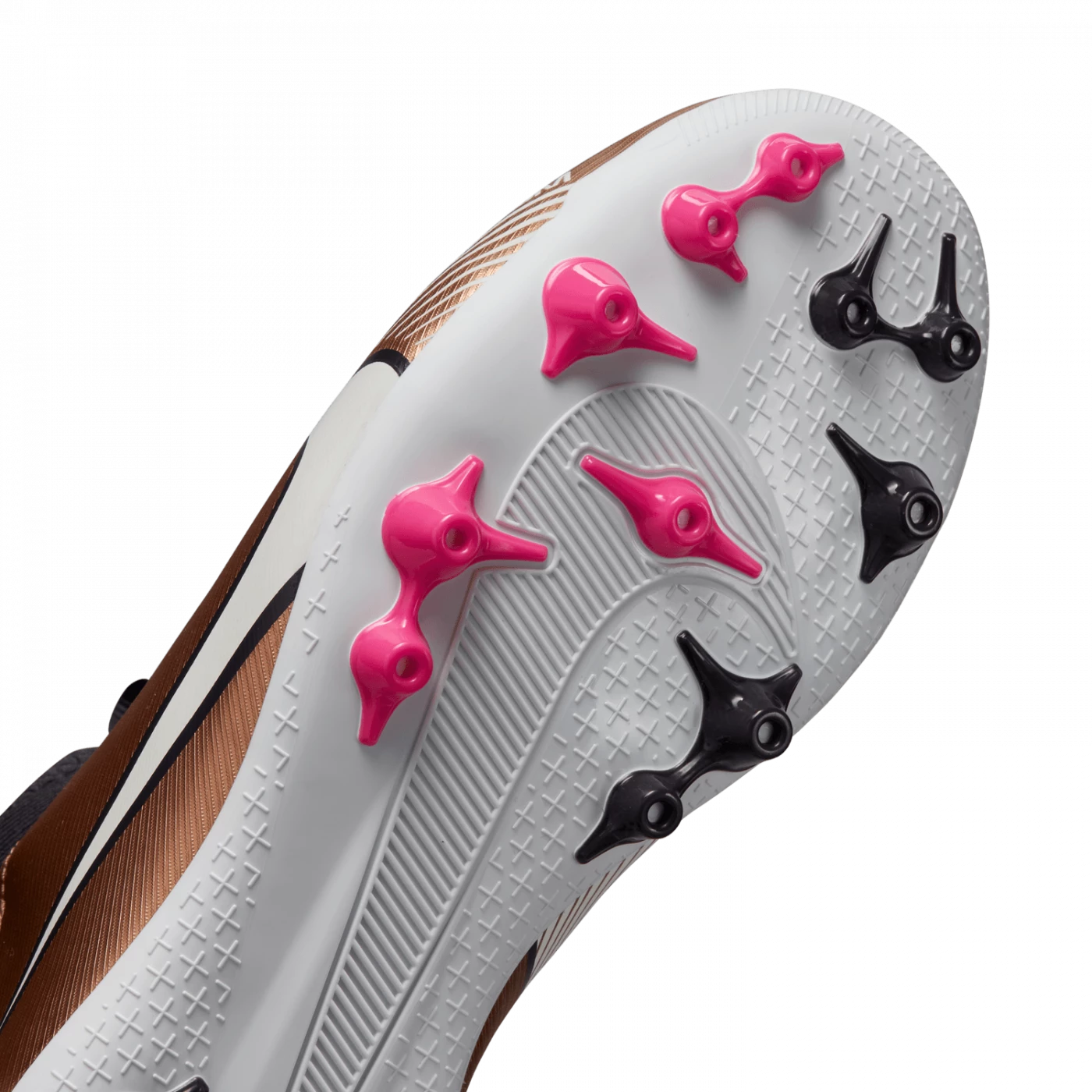 Along the sole plate, a unique color gradient recalls copper and its energy-conducting properties. We’ve juxtaposed a sophisticated Space Dust hue around the studs with pops of white and contrasting copper, as well as an extra vibrant pink hue. The upper is in metallic Liquid Chrome.