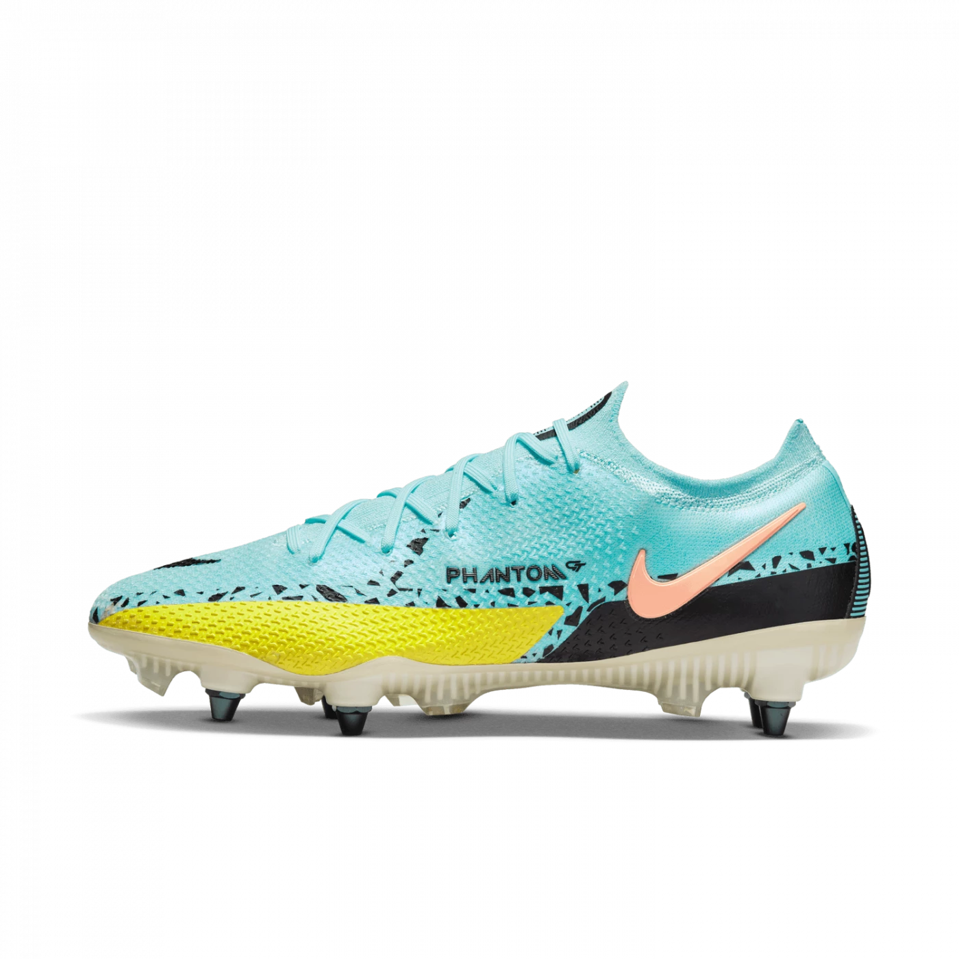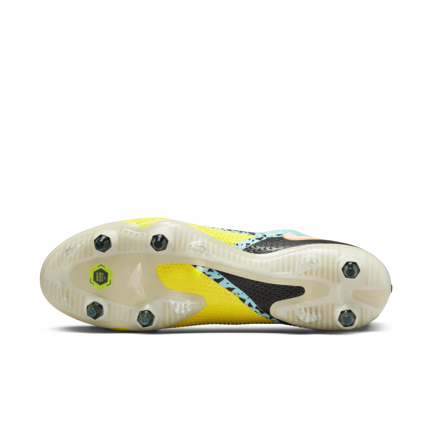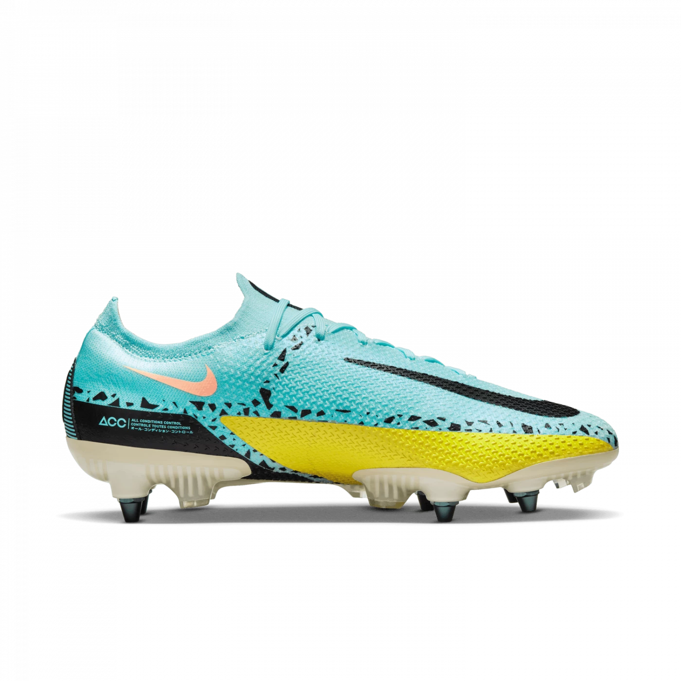 Taking a cue from Phantom GT, the Nike Phantom GT2 Elite SG-Pro AC shoe combines updated design and raised pattern for an ideal rotation for control of the ball’s trajectory. The asymmetrical lacing creates a clean hitting zone perfect for dribbling, passing and precise shots. The metal studs with screw attachment are designed for ideal power on wet fields, while the Anti-Clog Traction technology on the sole plate avoids the accumulation of mud.