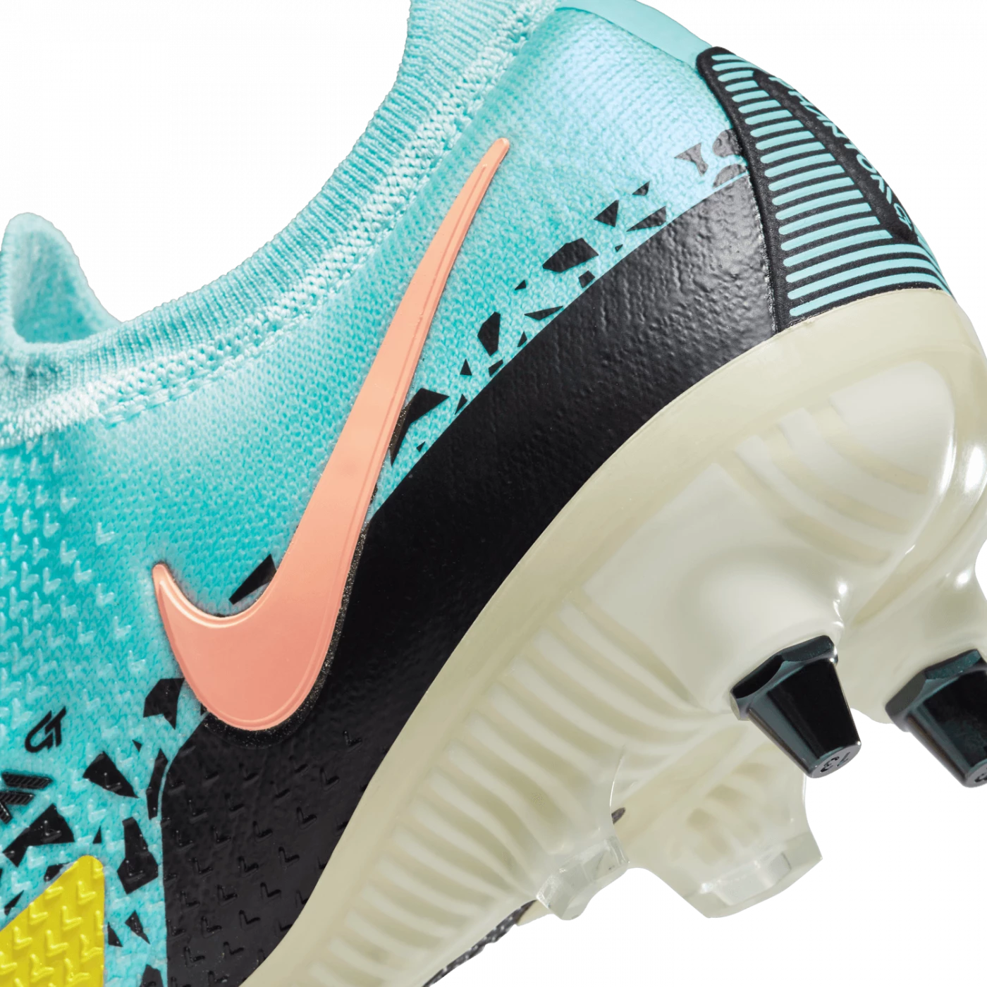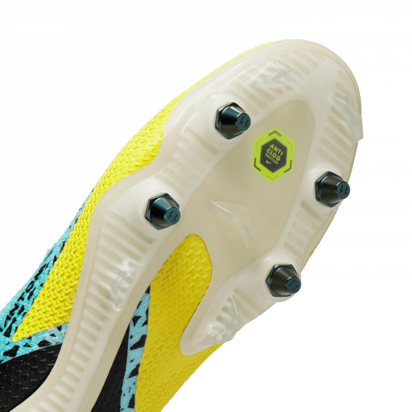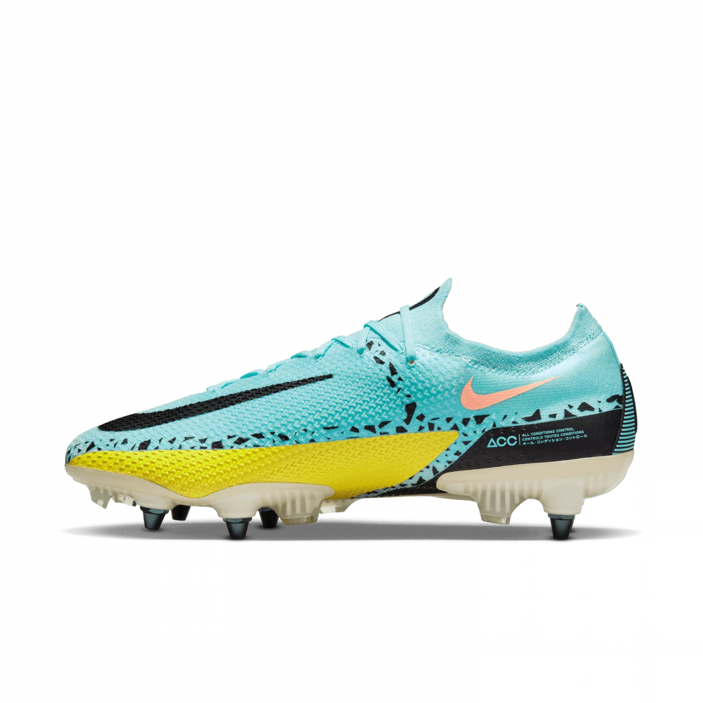 Taking a cue from Phantom GT, the Nike Phantom GT2 Elite SG-Pro AC shoe combines updated design and raised pattern for an ideal rotation for control of the ball’s trajectory. The asymmetrical lacing creates a clean hitting zone perfect for dribbling, passing and precise shots. The metal studs with screw attachment are designed for ideal power on wet fields, while the Anti-Clog Traction technology on the sole plate avoids the accumulation of mud.