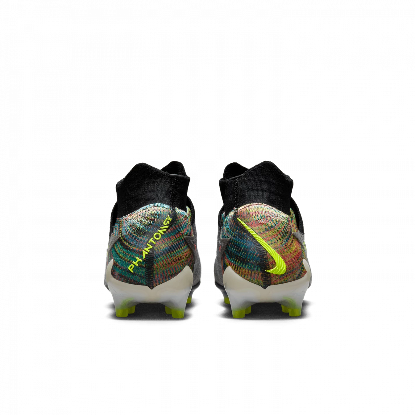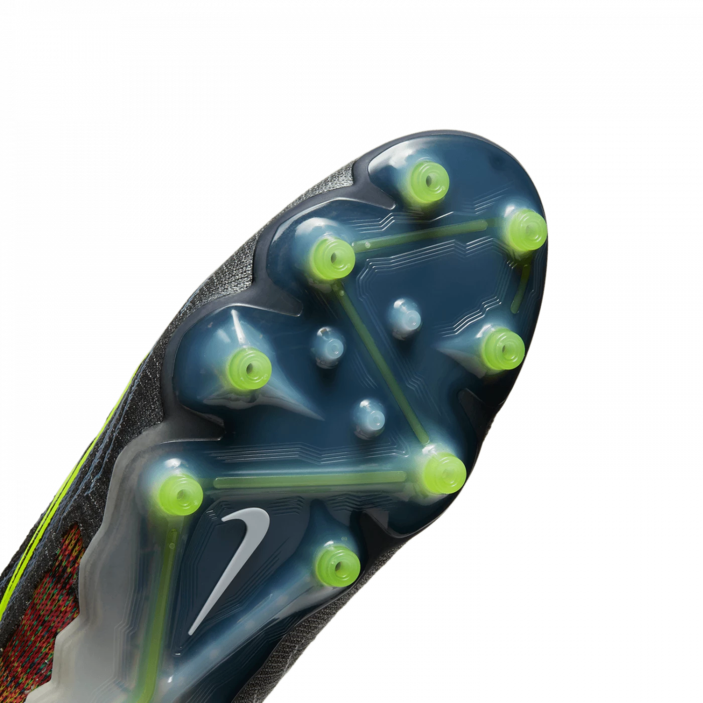 The rainbow-coloured multi-knit Flyknit in the heel is inspired by original Nike Flyknit footwear that brings a breathable, energetic element. Check out the electric-looking, right-slanting Swoosh logos. And don’t forget to look for the black-to-white plate fade with Volt-coloured stud tips on the bottom.