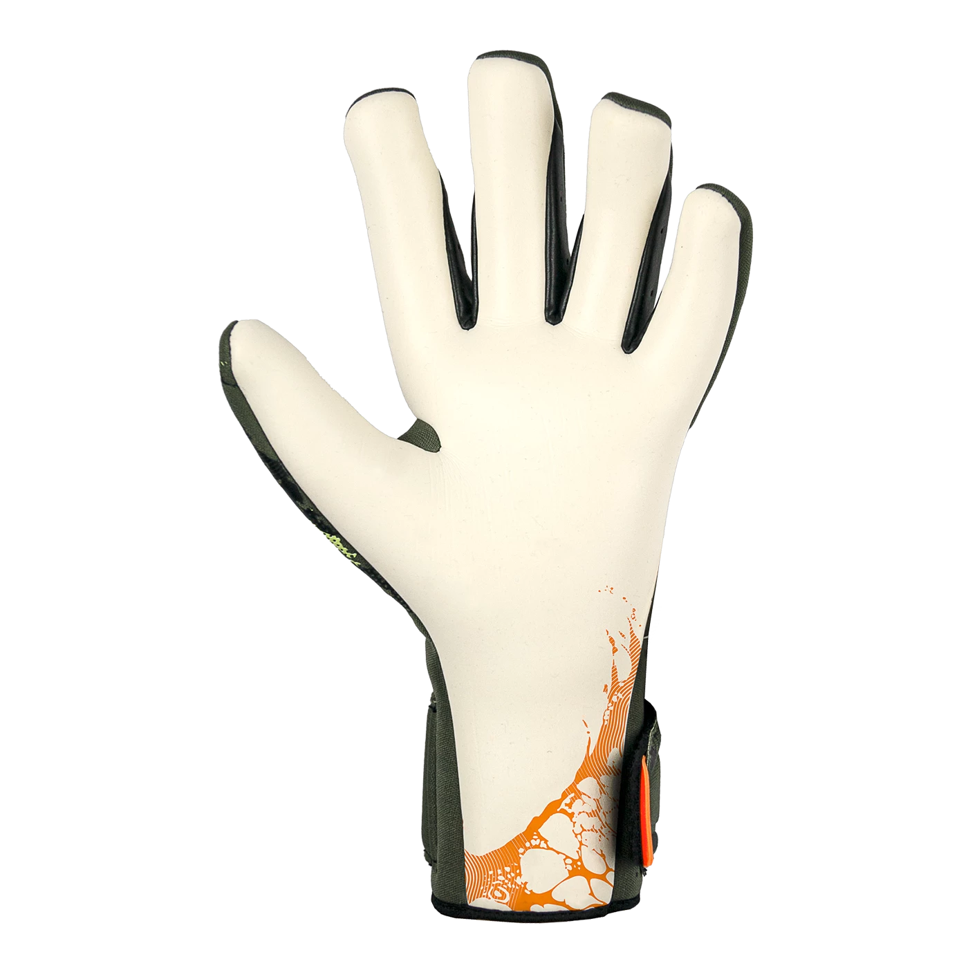 Developed and designed with Unai Simon, Spain’s Number One Keeper. He will play this second-skin fit construction of the Pure Contact during the World Cup 2022. The style is characterized by a very direct fitting neoprene backhand as well as an evolution negative cut around the fingers. The extra-long white Gold X palm latex offers the biggest possible catching area also in the wrist zone. This glove comes with the new and special AdaptiveFlex Closure System. To don’t cover the palm latex, there is only a half strap that covers the backhand to keep space for the extended catching area. Great wrist support is of course guaranteed.